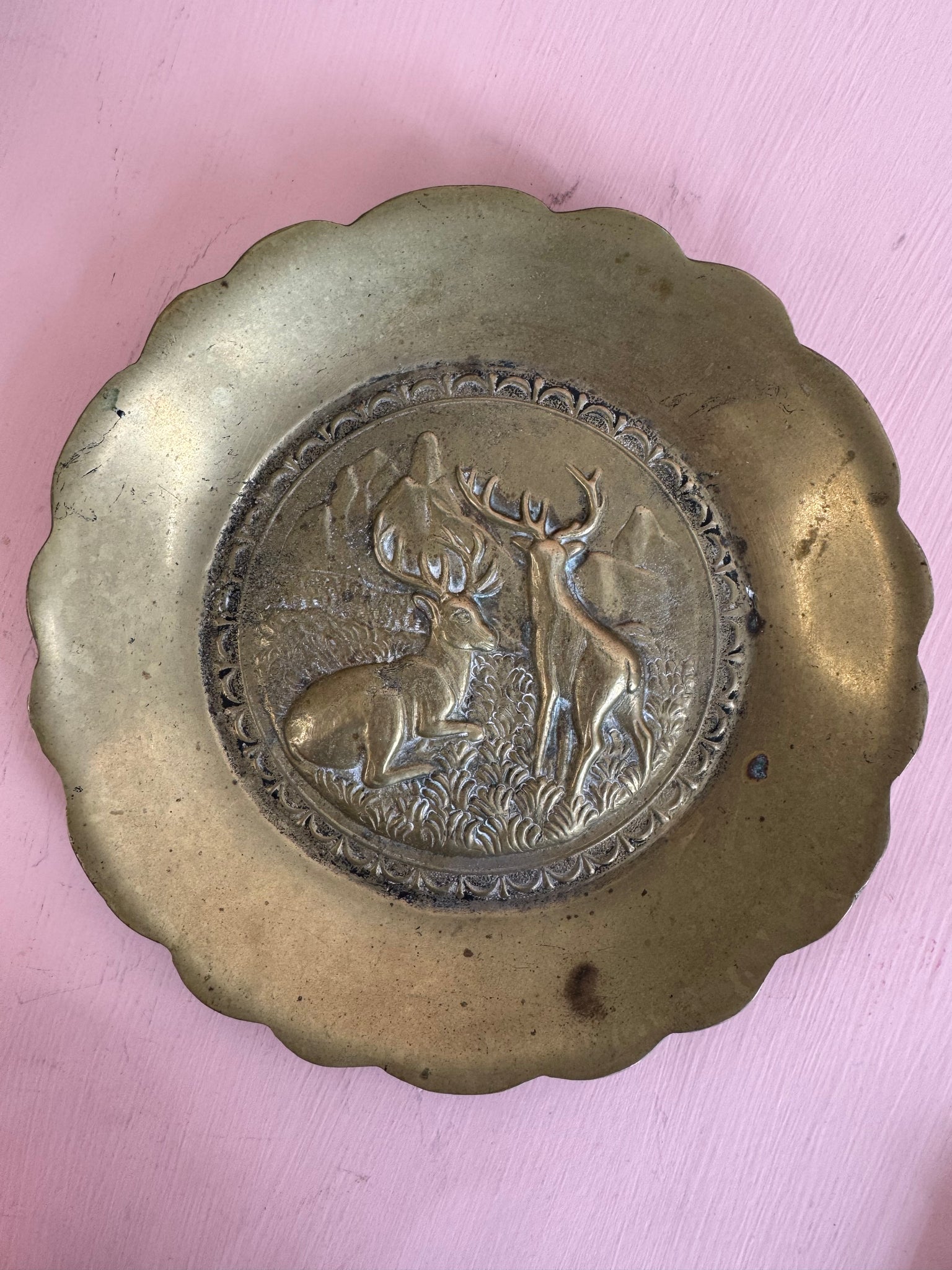 Talk about AMAZING!!! This brass plate with two deer on it. WOW! It’s 3D and oh so good. And the scallop edges just make it even better! Does have a piece on the back to hang it.