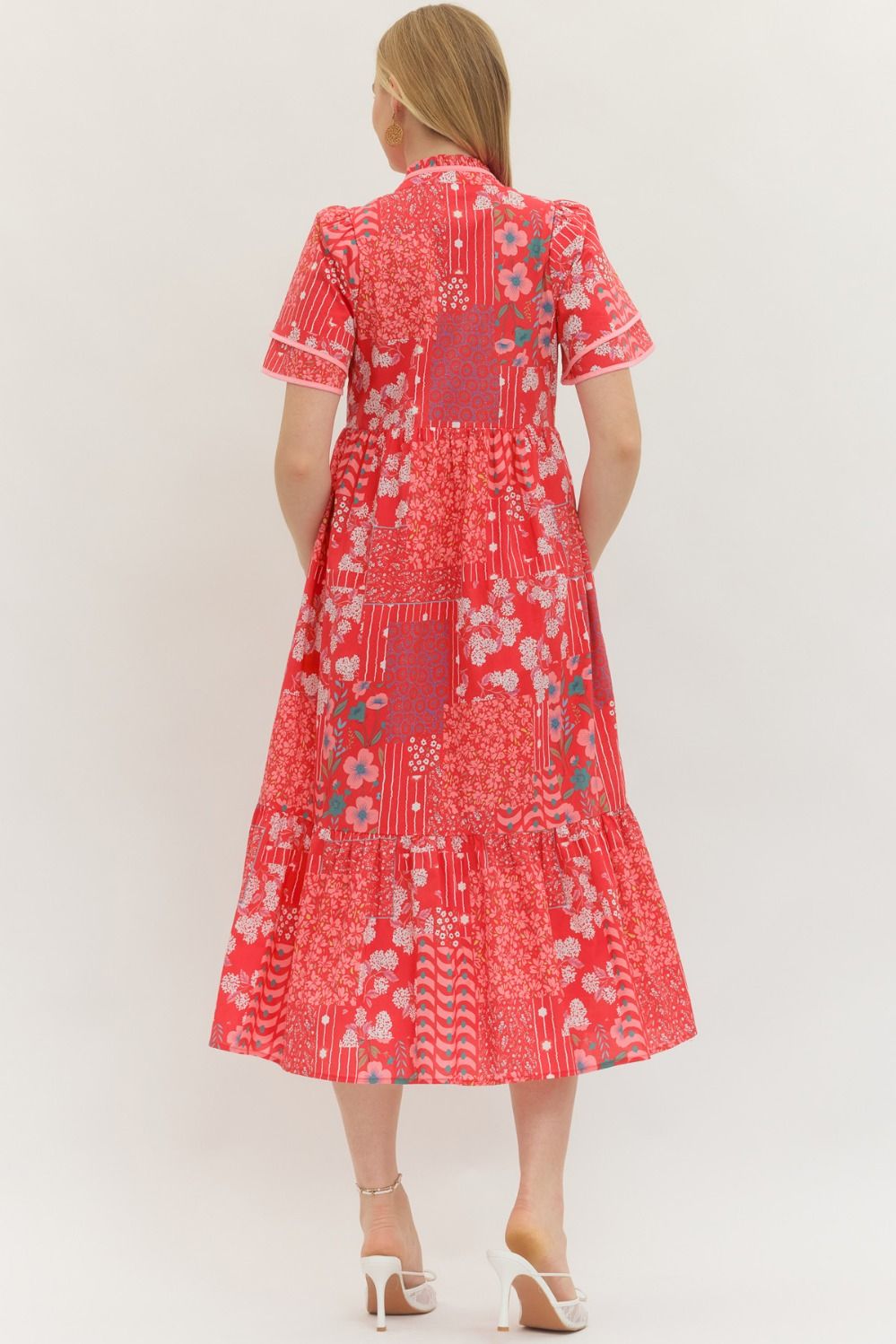 Floral print short sleeve midi dress featuring contrast trim detail. Button closure at front. Side pockets. Lined. Woven. Non-sheer. Lightweight.