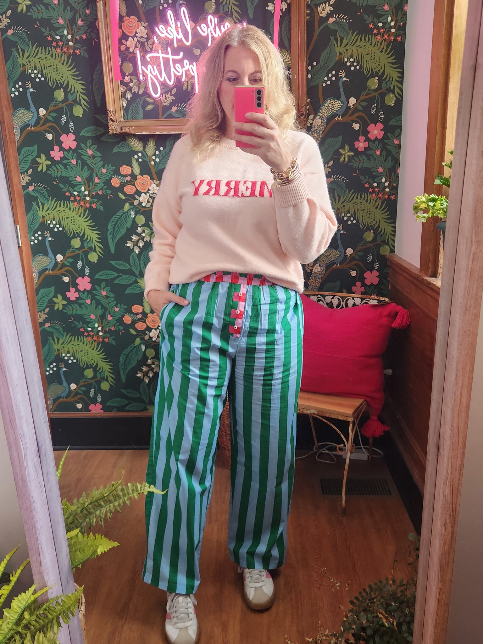 Made from 100% cotton with elastic waistband and on seam pockets. These Striped Lounge Pants are your new festive go-to for cozy nights in and joyful mornings. Made from soft cotton and cut with a relaxed 29" inseam, these pants feature a colorful holiday stripe pattern that brings major cheer. The contrast waistband and button detailing add a fun twist, while roomy side pockets keep it functional.
