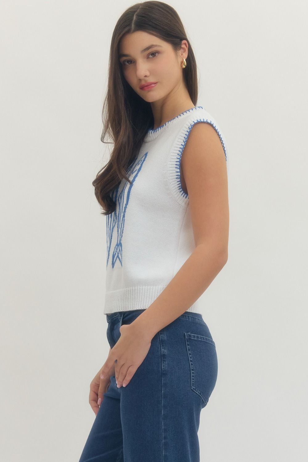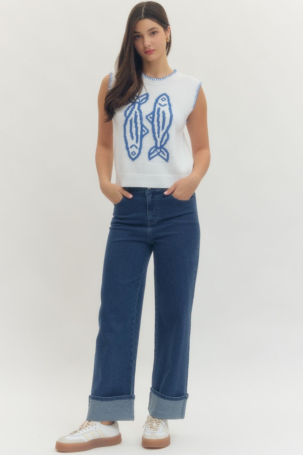 Fish graphic sleeveless knit top featuring ribbed neckline, armholes, and hem. Contrast stitch at neckline and armholes. Unlined. Knit. Non-sheer. Lightweight.