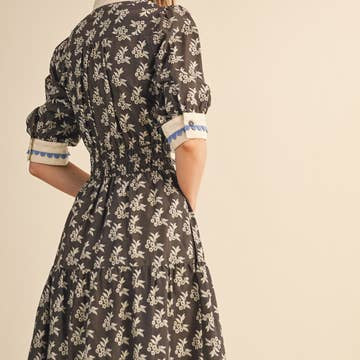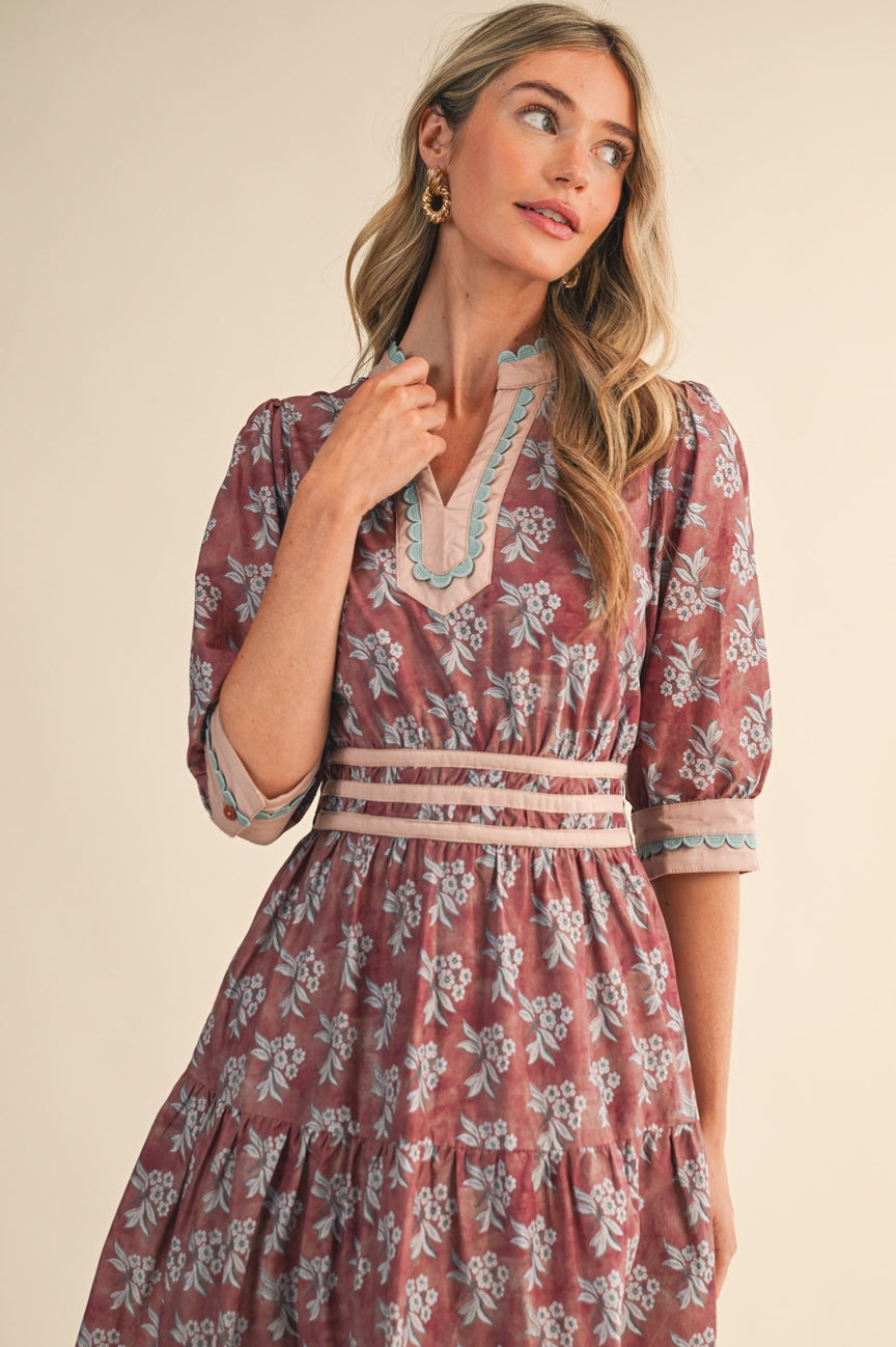 Floral print contrast binding scallop trim midi dress