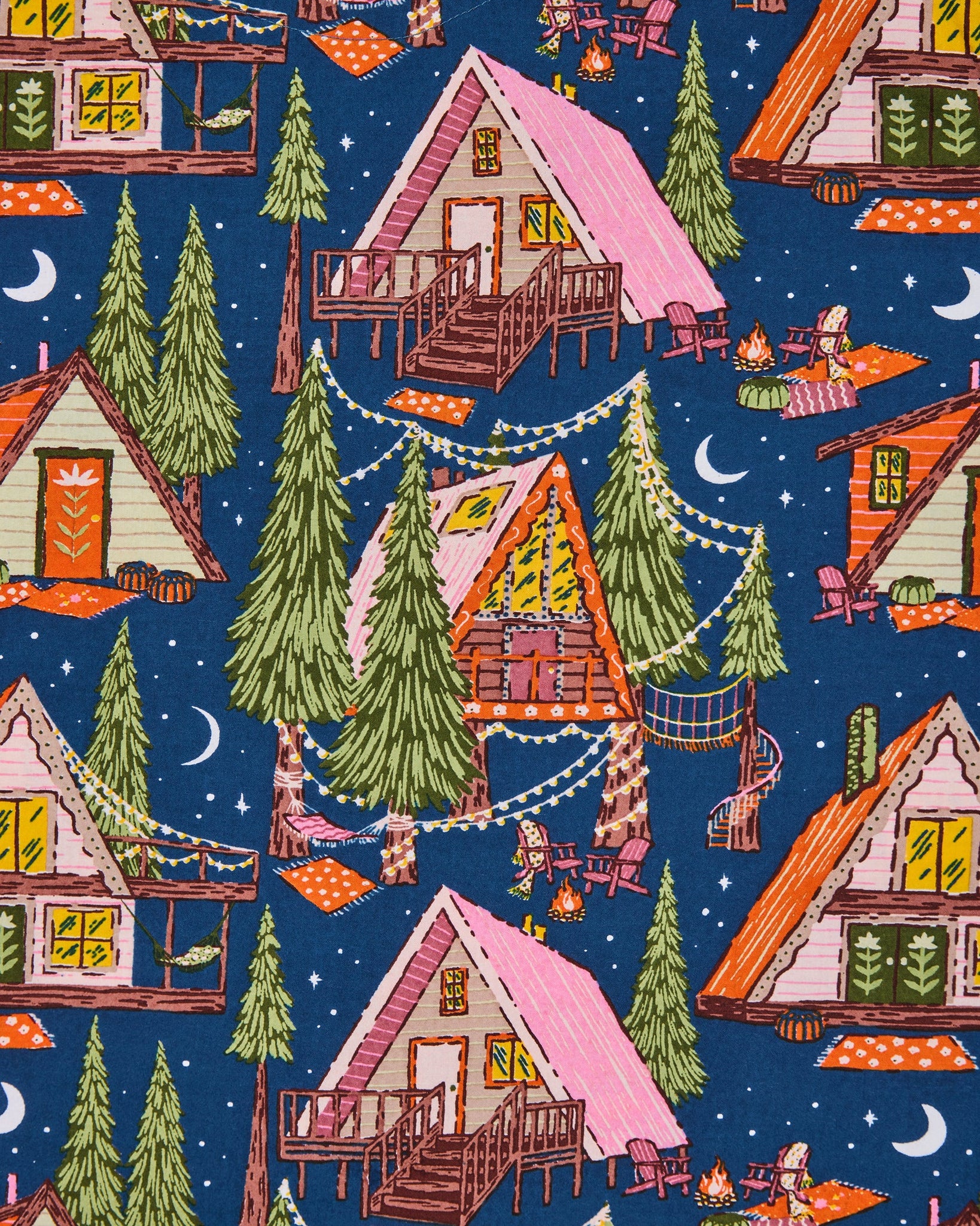 These cabin print pajama pants in starlight blue are made from breathable 100% organic cotton, featuring cozy A-frame cabins, campfires, and starlit skies. With a relaxed fit and pockets, these organic cotton lounge pants are ideal for cool mornings and fall/winter nights. Pair with your favorite tee or mix and match from our pajama bottom and pajamas collections.
