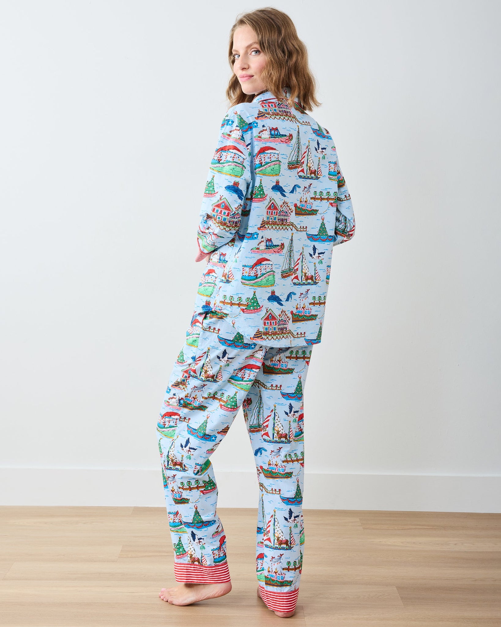 Celebrate the season in our Sugar Plum Ferry nautical pajama set. These festive holiday pajamas feature adorable boats, decorated docks, and whimsical seaside creatures on breathable organic cotton. The relaxed button-down top pairs with blue long pajamas with pockets for an effortlessly comfortable cotton pajama set. Perfect for holiday mornings at the cottage.