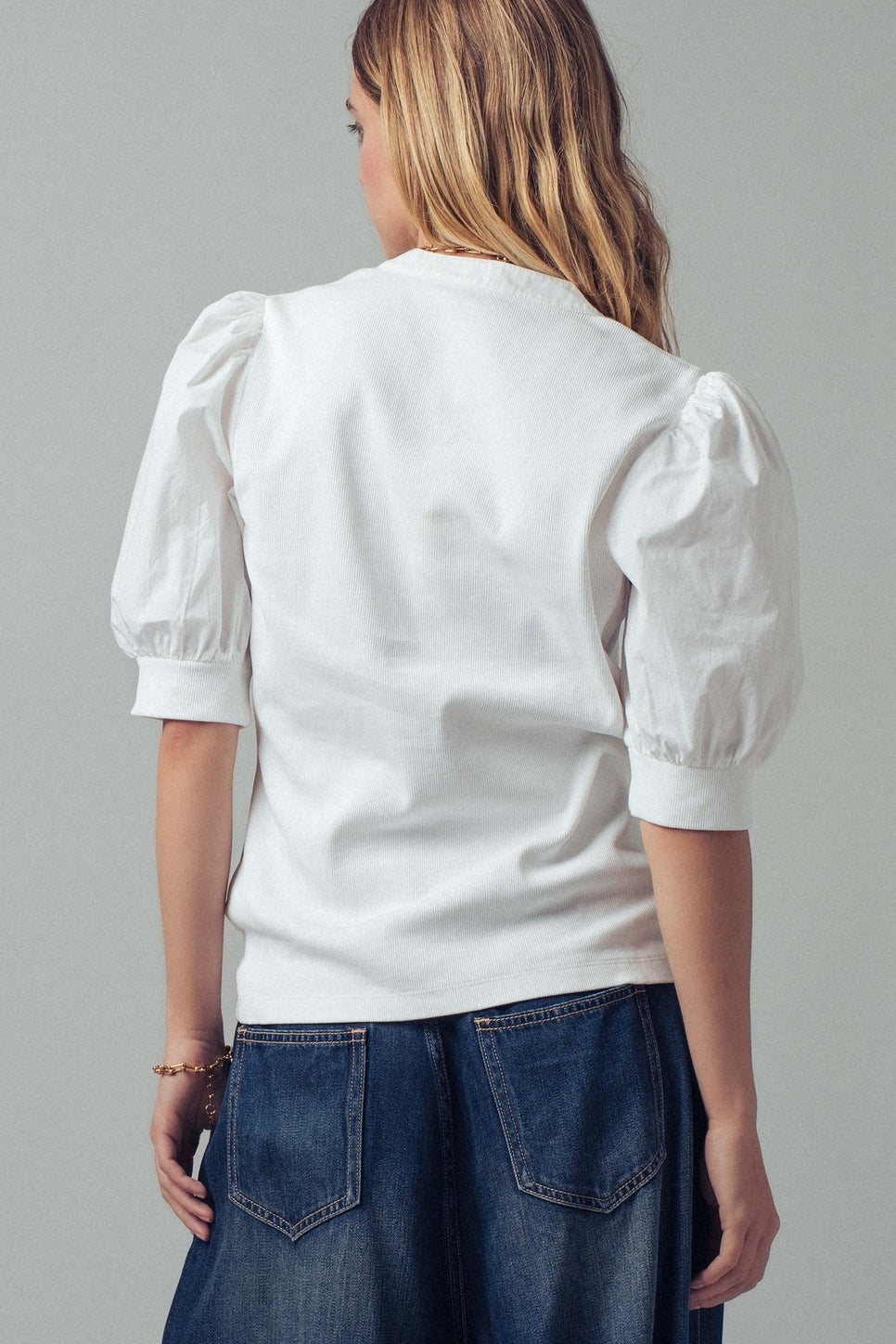 Elevate your everyday essentials with this crisp top, designed with a stylish mixed-media construction. The bodice is crafted from a comfortable cotton-spandex blend with a textured finish, while the puff sleeves are made from structured 100% cotton for a dramatic silhouette. A classic henley V-neckline with a button placket adds a casual yet polished touch, making it perfect for tucking into your favorite denim.