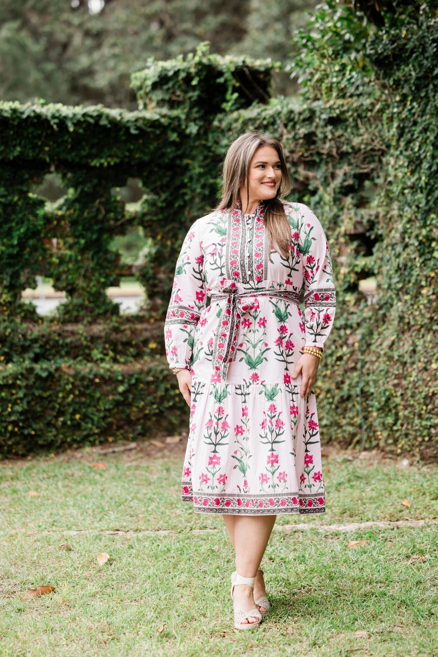 Introducing the Caroline Dress in Rose d’Iris, a graceful blend of French garden romance and timeless Southern femininity. Rose d’Iris, meaning Rose of the Iris, is inspired by blooming iris petals and soft rosy florals found along sunlit garden paths in Provence. The delicate blush tones create a look that feels refined, uplifting, and effortlessly enchanting. Crafted from soft, breathable 100% cotton and double lined for comfort, this dress features our exclusive Rose d’Iris hand block print, thoughtfully placed to flatter every silhouette.
