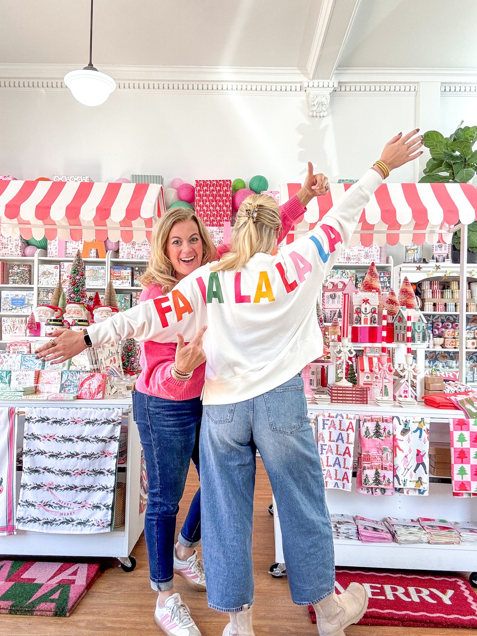 Get in the holiday spirit with the "’Tis the Season/Fa La La" Relaxed Sweatshirt! This ivory pullover features cheerful red chenille lettering across the front and a festive rainbow “Fa La La” print design wrapping around the sleeves and back. With its drop shoulders and oversized fit, this sweatshirt is made for cozy nights in, cookie baking, or spontaneous dance parties by the tree. Pair it with your favorite jammies or red denim for a merry and bright look that pops!