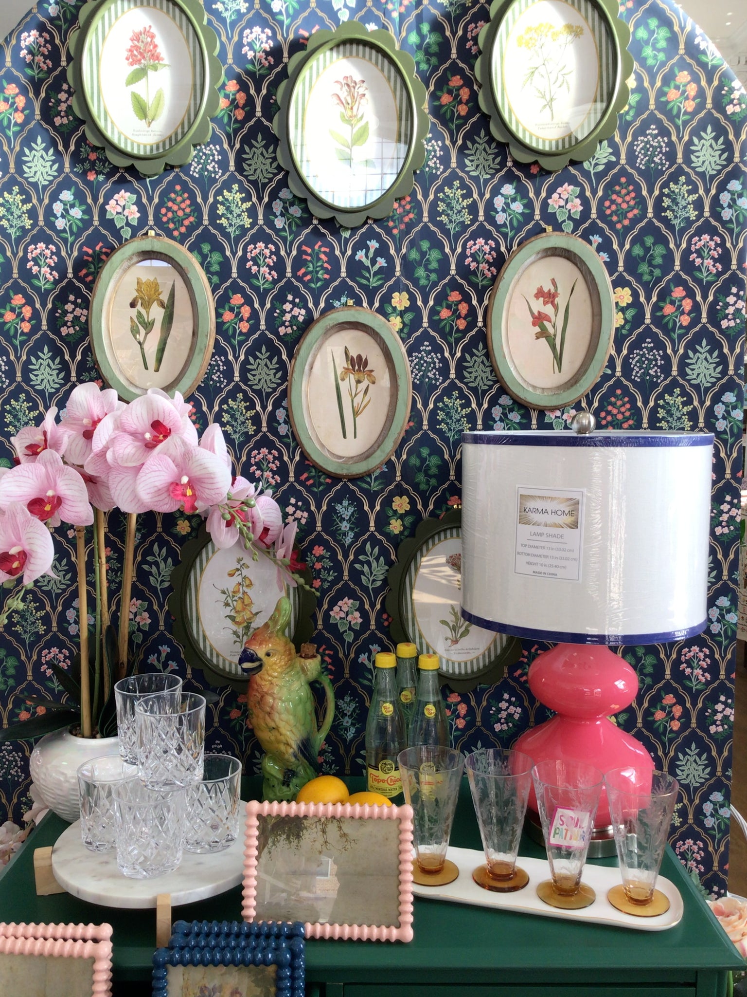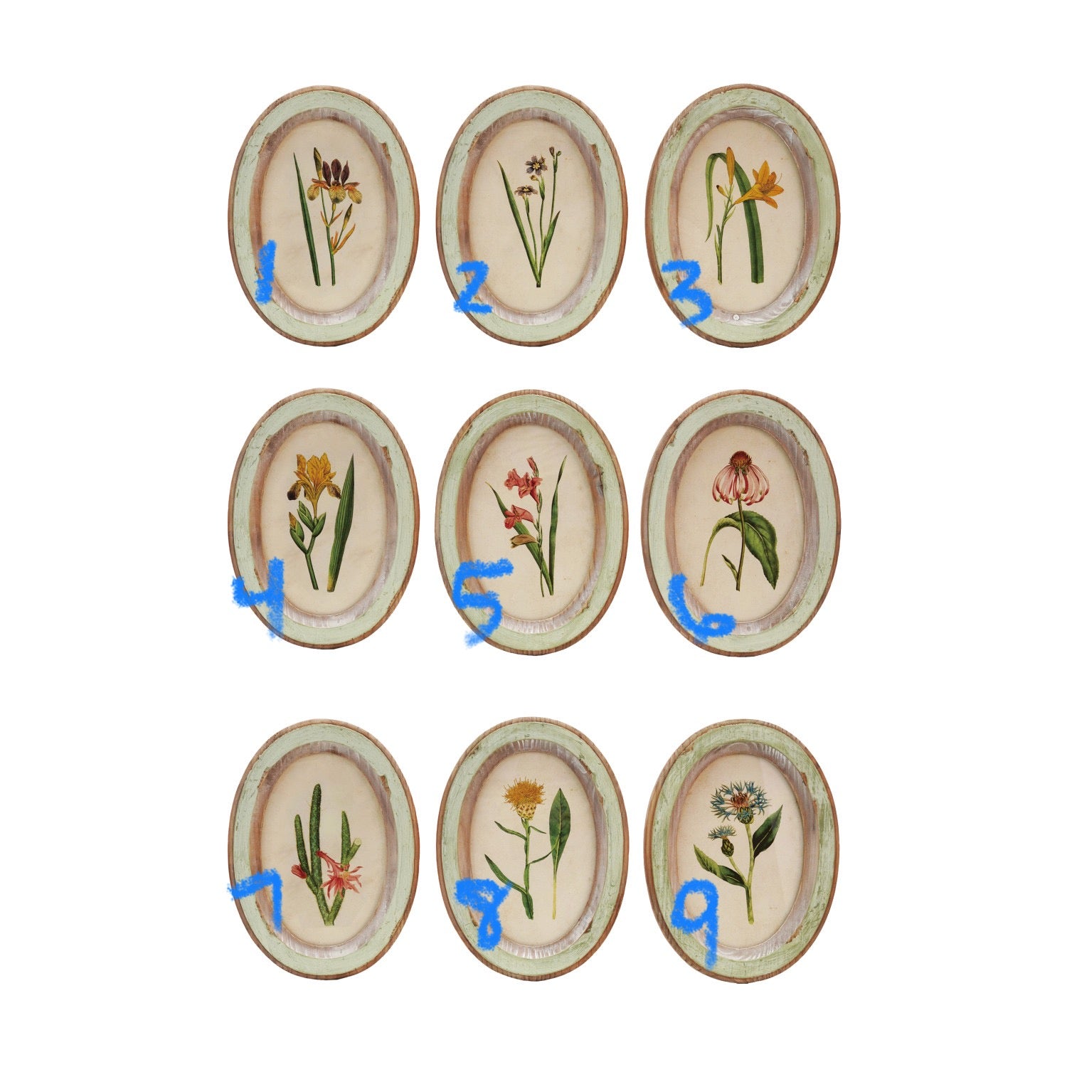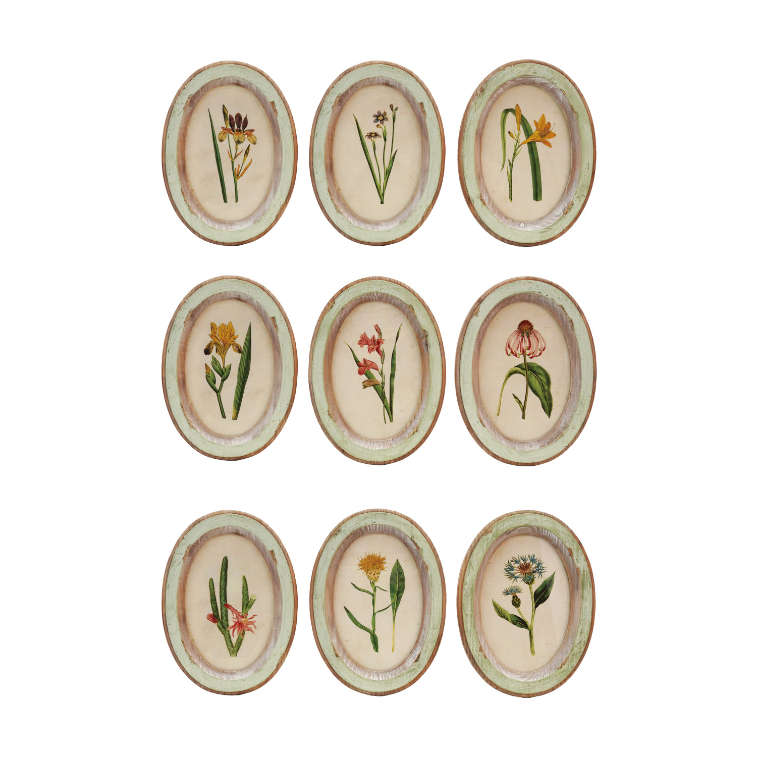 Botanical print in distressed green wood frame.
