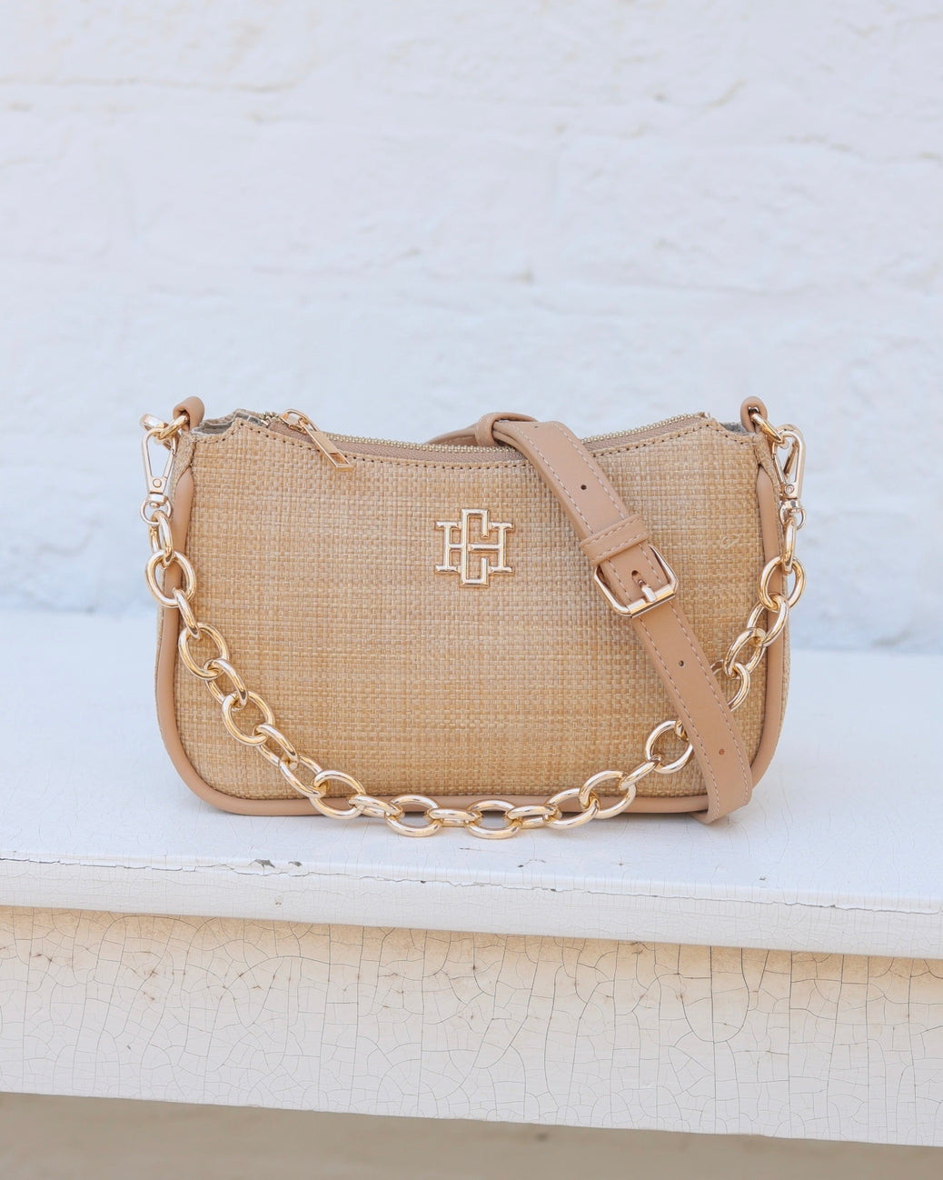 The Joan Crossbody in Natural. This fabulous straw crossbody is a wonderful size for travel and everyday wearing! It is made with a straw, vegan leather that is oh so soft. There is a removable chain accent that can also be used as a carrying strap as well. The crossbody strap is adjustable and removable as well. It features the Caroline Hill logo on one side and has a top zipper closure. The interior of the bag has a zippered pocket and two short open pockets as well.