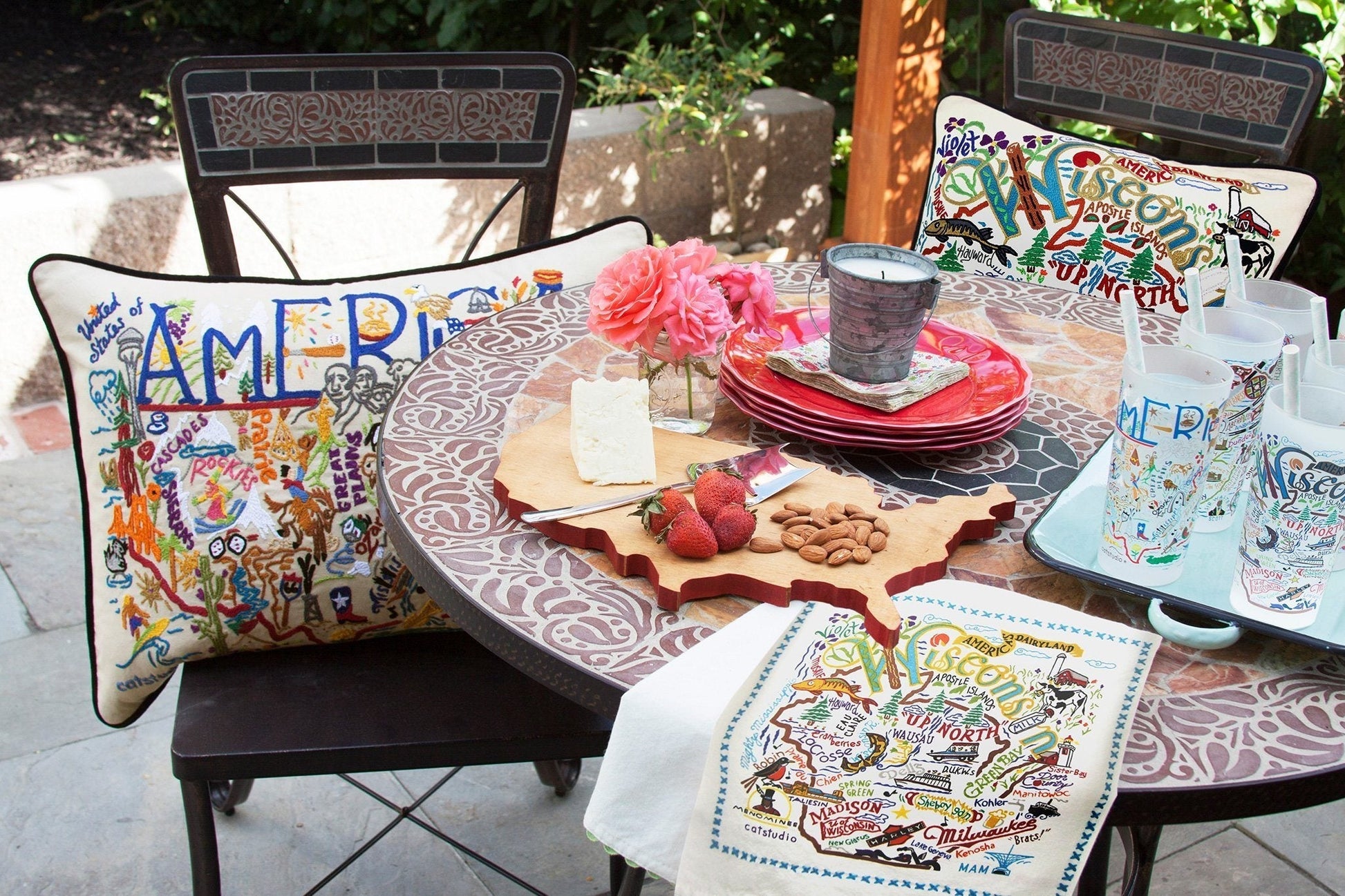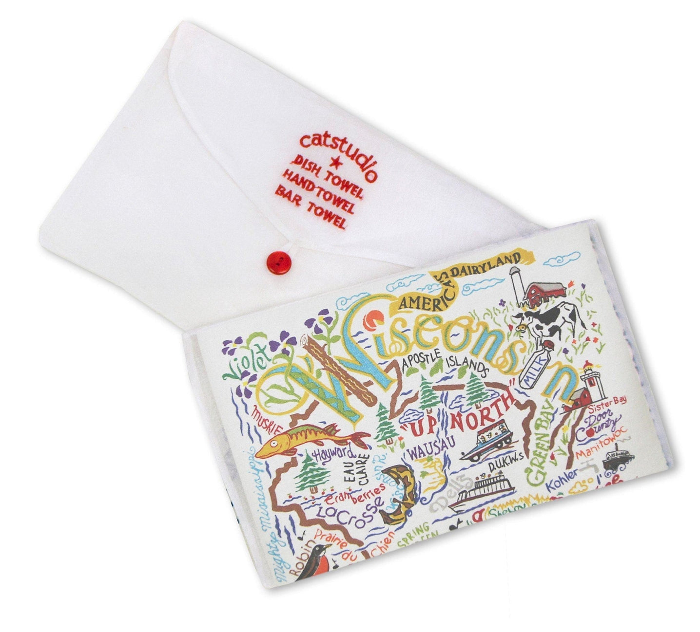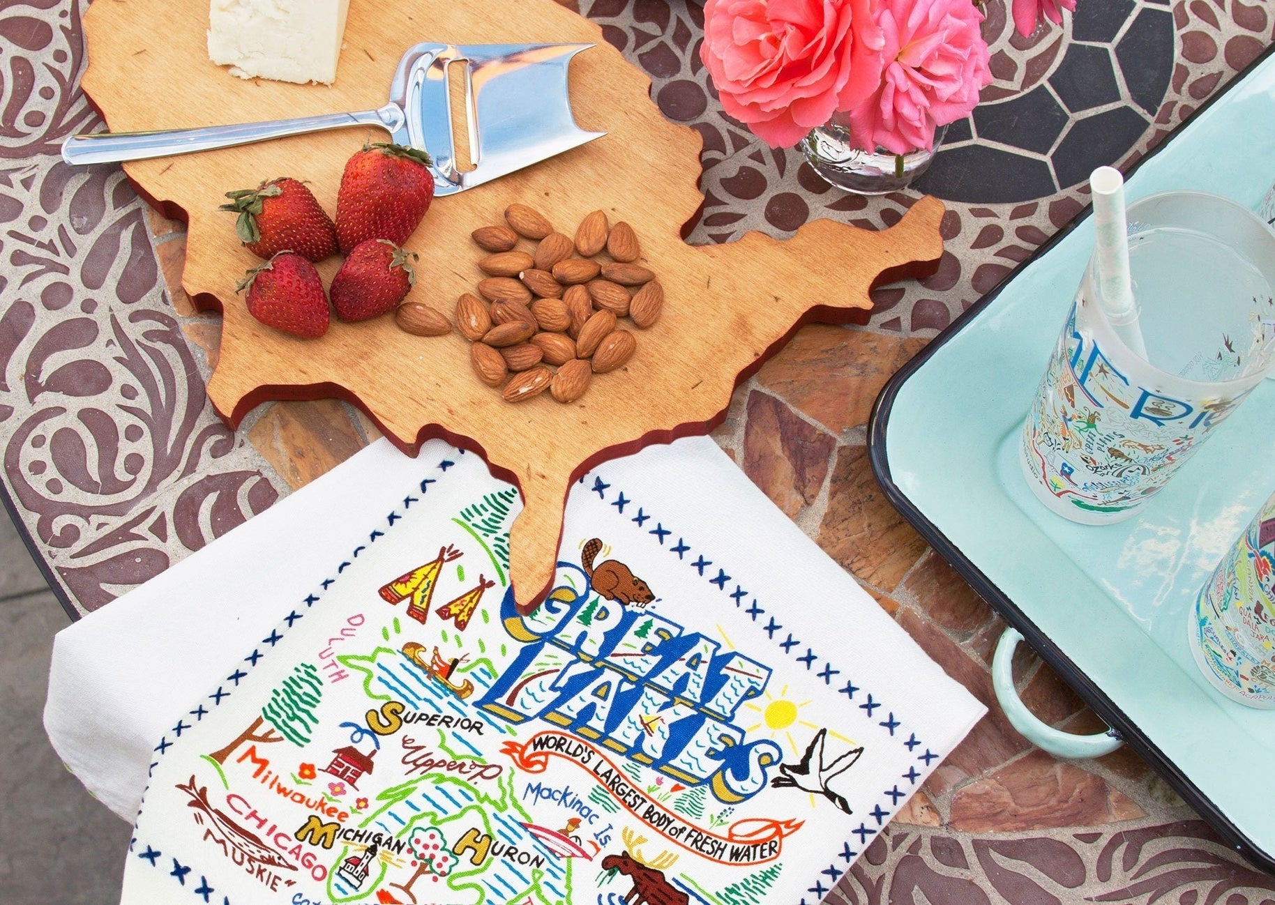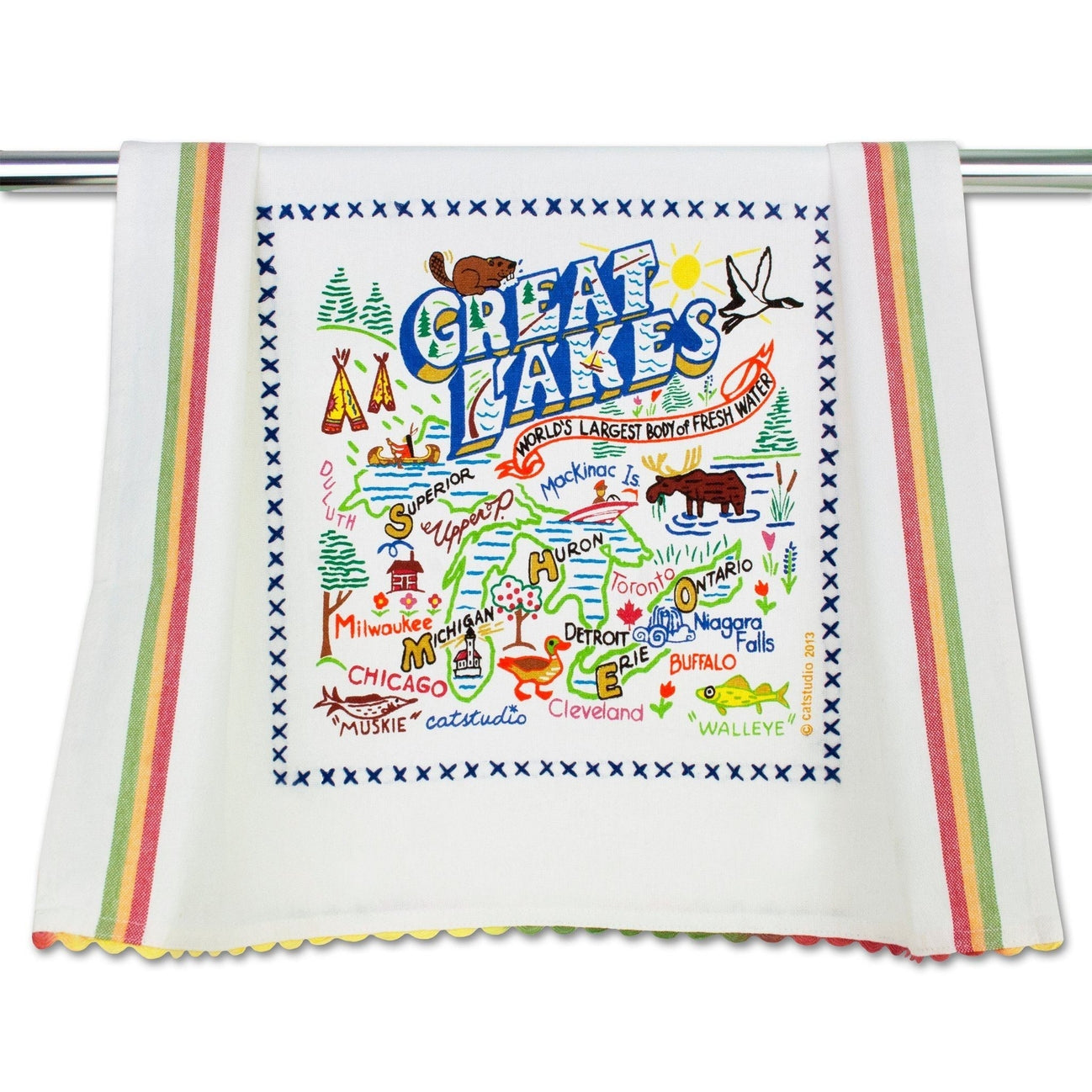 Each dish towel is made of hand-loomed cotton and the design is printed using the labor-intensive, HAND-swipe silk-screen process with 12 colors (that's 12 screens for each towel!). The design is then framed with a HAND-embroidered border. Our towels are finished with three cheery woven stripes down the sides and hand-dyed rick-rack at the top and bottom, adding a charming vintage touch.