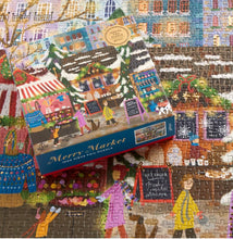 Merry Market 1000 Piece Foil Puzzle by Galison illustrates the spirit of the holiday season with this wintry outdoor market scene, sparkling with gold foil accents.